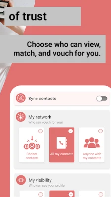 4. You’re always in control – we’ve made it super simple to hook up your network to the platform. With one tap, you can sync all your phone contacts and choose which friends you’d like to invite to be your personal matchmakers. It’s safe and secure, and there’s no risk you’ll invite Dave, the plumber, to set you up with his mates.