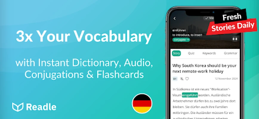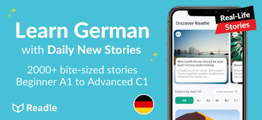 Learn German 5-min a day with personalized stories and daily news on your level. Readle is a German language learning app made for learners that strive to get past the basics, and create a real learning habit.