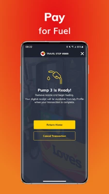 Activate the pump from the comfort and safety of your cab with Love’s Pay. Select your pump and fuel, and then answer the prompts as you do at the pump today. Once authorized, lift the nozzle and fuel. You may also add and manage commercial fuel cards in your wallet, as well as view and share transaction and loyalty receipts.