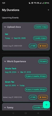 Key Features: Create and manage duration groups with multiple events Set custom start and end dates/times with 12/24-hour format support "Set to Today" feature for quick current date selection Automatic duration calculations Organized display with upcoming events section Edit and delete functionality Local data storage - no internet required Perfect for tracking