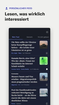 * Ihren persönlichen Bereich «Meine NZZ» mit eigens kuratiertem News-Feed, sowie gespeicherten Artikeln zum später lesen
