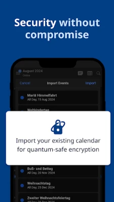 • Quantum-safe encryption: End-to-end encrypted data exchange with all Tuta Calendar users and with users of other calendar apps (via optional password-protected event invites).